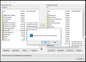 Ao clicar no botão Efetuar transferência de arquivos, irá abrir uma tela com o diretório do computador local e do computador remoto, para que seja localizado o arquivo e a pasta de destino a ser transferido.